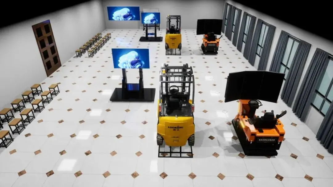 此外,硕博科技还推出,挖掘机模拟训练系统与实物模型联动解决方案;叉车模拟训练系统与实物模型联动解决方案。